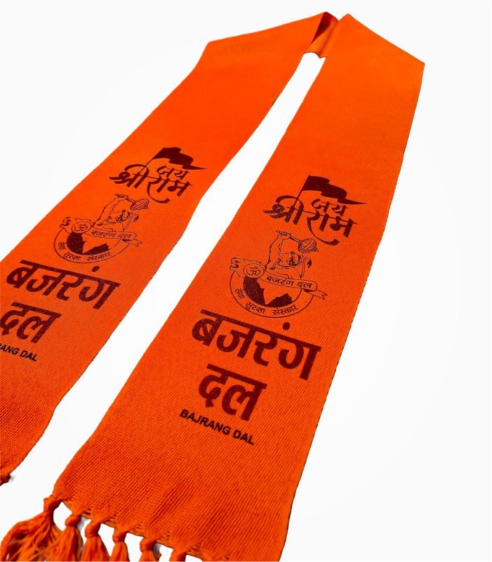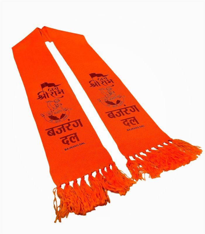 The Bajrang Dal Muffler reflects a strong visual identity commonly seen in public gatherings and events across India. The saffron color adds a bold presence, while the printed elements enhance its overall appeal.