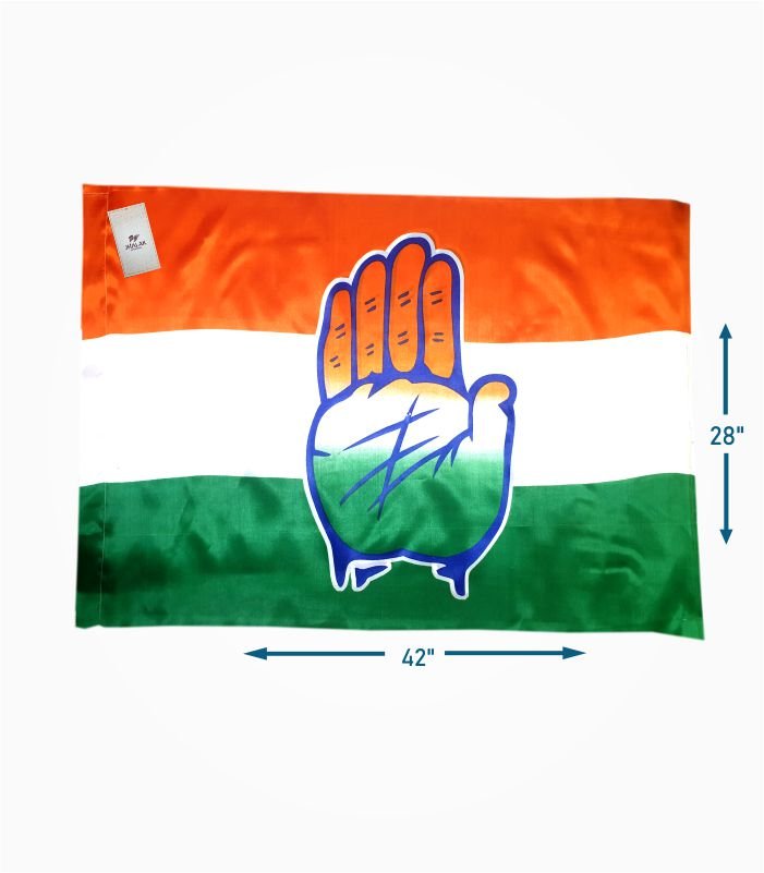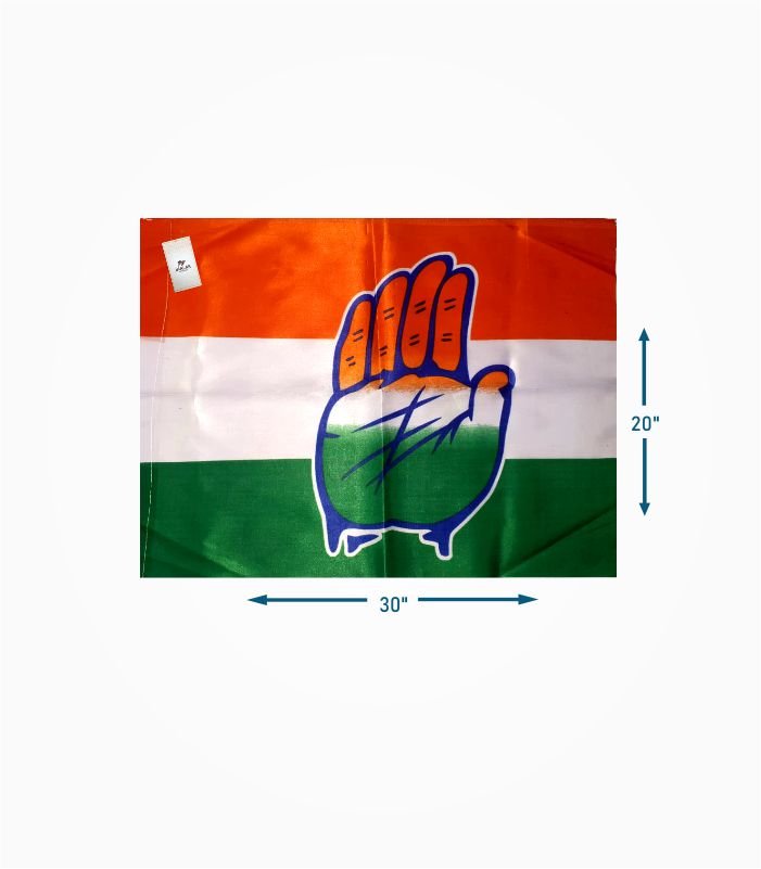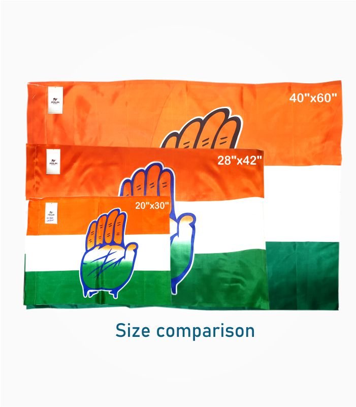 Buy Congress Party Flag made from quality satin fabric, available in three sizes: 20×30 inch, 28×42 inch, and 40×60 inch. The flag displays the traditional tricolor (orange, white, and green) with a clearly printed hand symbol in the center. It’s suitable for campaign decoration, event setups, and indoor or outdoor displays.
