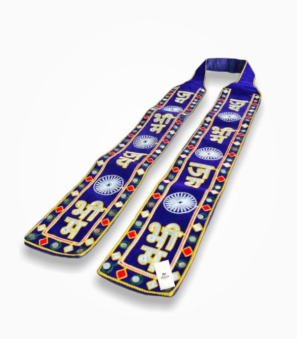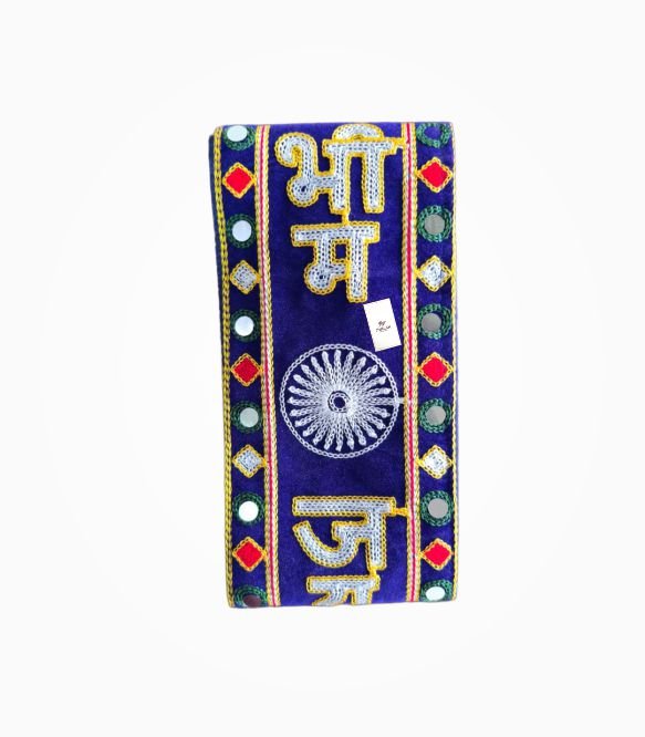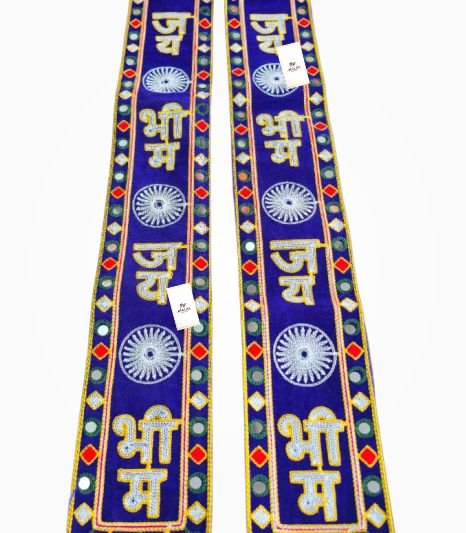 A Jai Bhim muffler is a blue campaign scarf featuring the phrase “जय भीम”, commonly used during rallies, social gatherings, and events related to Ambedkarite identity and social awareness movements. These scarves often include Ashoka Chakra symbols and decorative embroidery, making them easily recognizable in public gatherings.