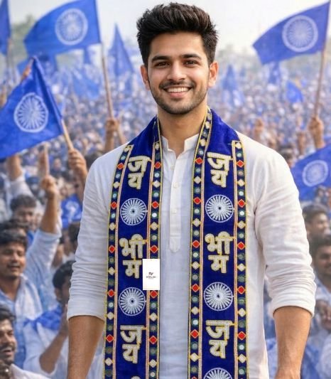 The Jai Bhim Muffler is a striking blue campaign scarf designed for rallies, gatherings, and public events where bold symbolic accessories create a strong visual identity. This embroidered muffler features “जय भीम” text with Ashoka Chakra motifs, carefully stitched on a deep blue base with decorative borders. The bright embroidery and structured design make the scarf highly visible during large public gatherings and campaign activities.