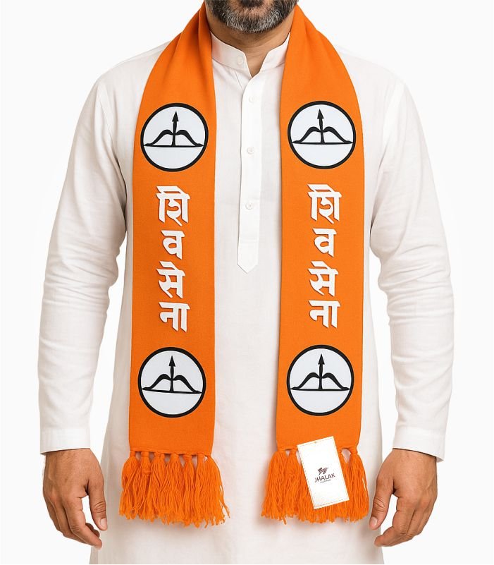 “The muffler proudly displays the distinct identity of Shiv Sena on both sides. Prominently centered along its length are the instantly recognizable bow and arrow election symbol in white. Below this emblem, the name ‘शिवसेना’ is clearly printed in bold white Devanagari script, ensuring immediate recognition. Meticulous digital printing guarantees vivid colors and sharp imagery. It maintains its crisp appearance for years, even after repeated use and washing.”