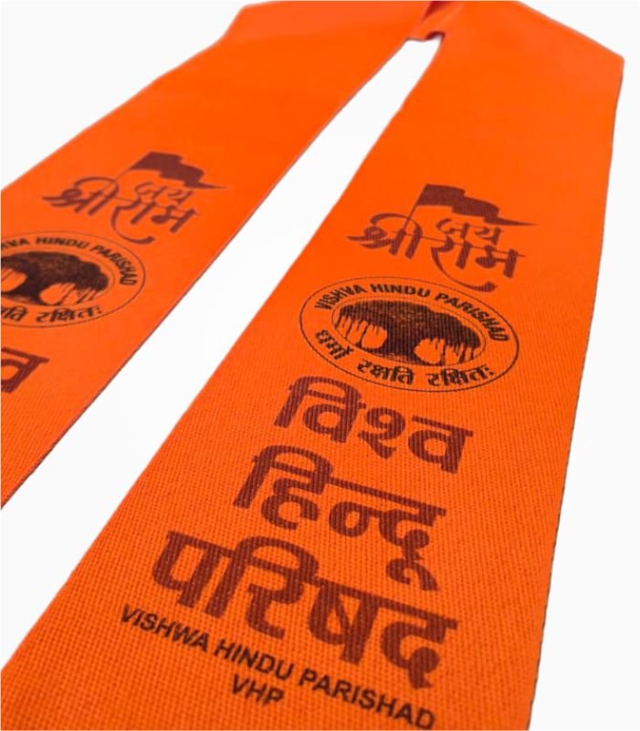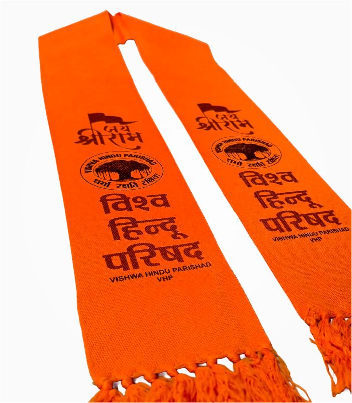 The Vishva Hindu Parishad Muffler represents a strong visual identity commonly seen in public gatherings and events. The saffron color adds boldness and visibility, while the printed design enhances its presence.